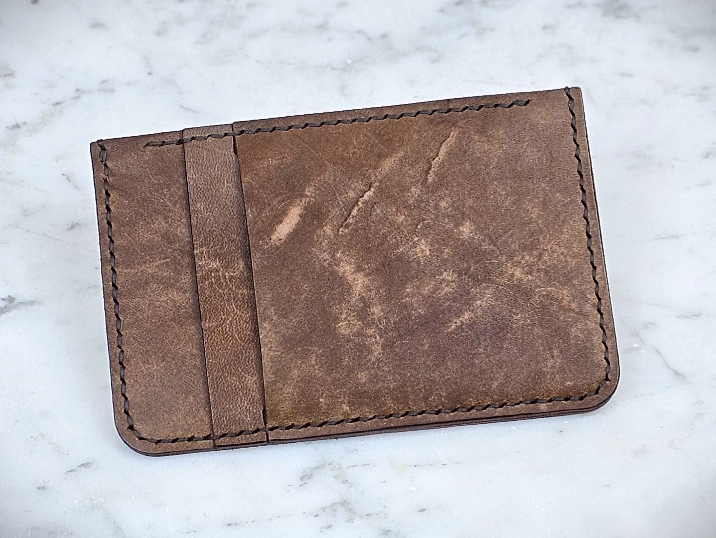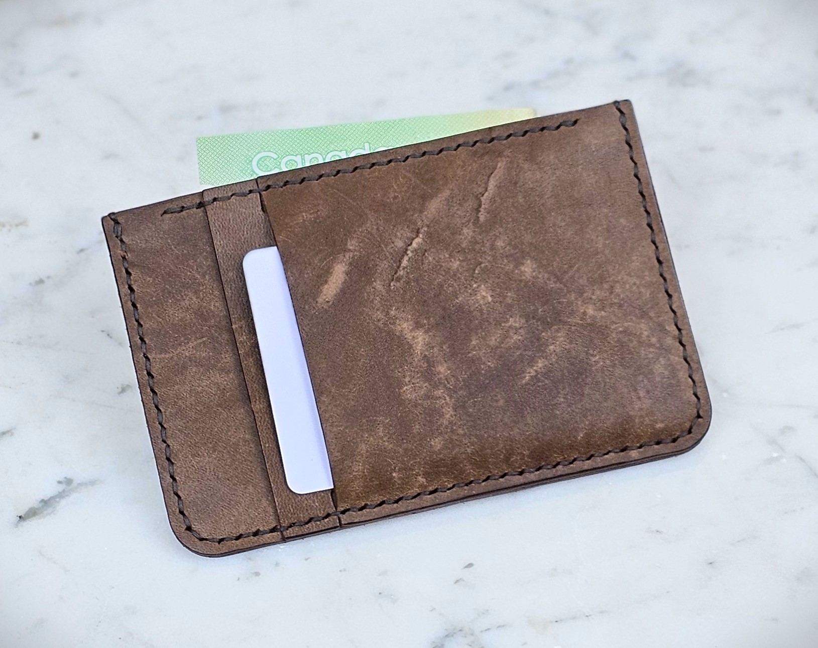 Porte-carte compact modèle Dave ! Fait en cuir et entièrement fabriqué à la main. Comportant 3 compartiments pouvant accueillir 6 cartes + billet de banque –